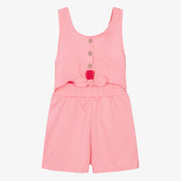 Blue chambray playsuit for younger girls by Mayoral, made in a soft cotton and lyocell blend. It has an elasticated neckline and waist, making it easy to pull on. There is delicate white detailing on the sleeves and simple popper fastenings between the legs.