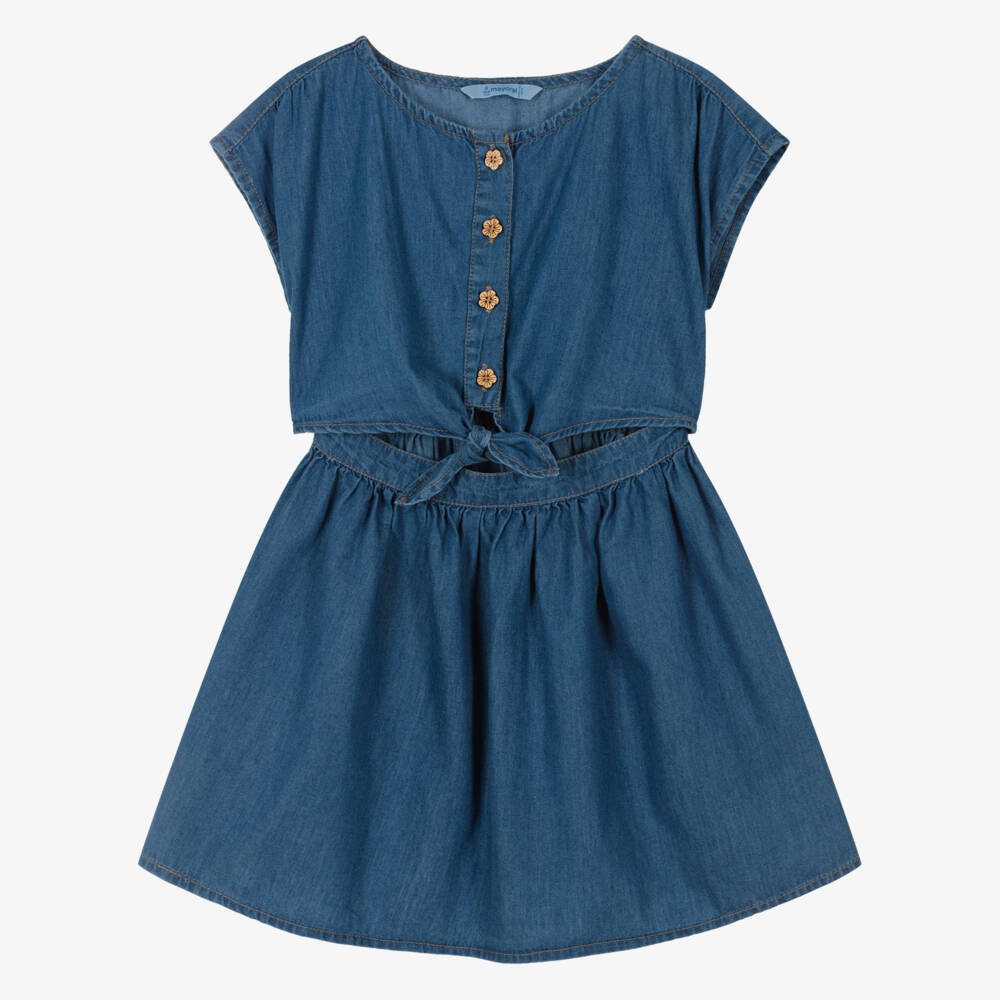 Blue dress for girls by Mayoral, made in soft, lightweight chambray. The bodice has cut-out detailing on the front, with ties that fasten in a knot, and pretty, flower-shaped button fastenings. The waistband of the gathered skirt is elasticated around the back for a comfortable fit.