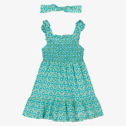 A pretty aqua blue jumpsuit for girls by Spanish brand Mayoral, made in soft chiffon with delicately placed squares woven into the fabric. This elegant style, suitable for an occasion, has a round neckline and short sheer sleeves with a scalloped edge. The bodice is beautifully embroidered with tonal flowers and fastens on the back with a zip. The bodice and wide, pleated legs are both lined with soft fabric to increase comfort and opacity.