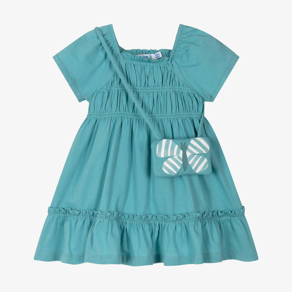 Teal blue cotton dress for little girls by Mayoral, made in soft, comfortable jersey with an elasticated neckline, ruched bodice and a ruffled hemline. With an easy to wear, over-the-head design, it comes with a little, padded shoulder bag that is ideal for coins and small essentials. It has a lovely butterfly print and a popper fastening.