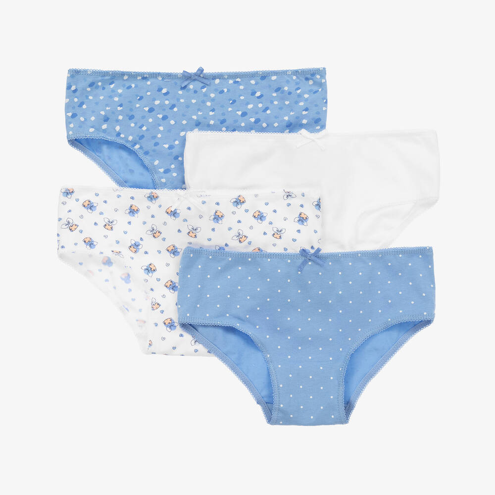 A pack of four blue and white knickers for girls by Spanish brand Mayoral, made from soft cotton jersey. Each pair has sweet picot trims, silky ribbon bow decorations, and comfortable elasticated waists. One pair is patterned with tiny polka dots, another has an abstract spot design, one is printed with cartoon girl faces and hearts, and the last pair is plain white.
