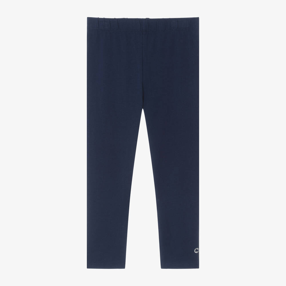 Simply styled, these navy blue leggings for girls are by Mayoral. Made from soft cotton jersey, they are printed with a silver logo detail on one ankle and have a comfortable elasticated waist.
