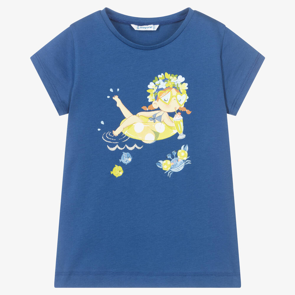 Fun cobalt blue T-shirt for girls by Spanish brand Mayoral, made in super soft and comfortable sustainable cotton jersey. This top has a summery girl printed on the front, enjoying a day at the beach and dipping her toes in glittery waves.