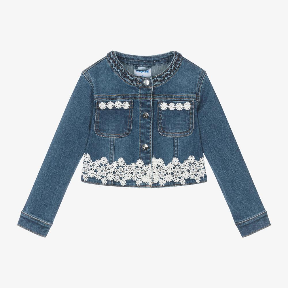 Girls blue denim jacket from Mayoral, with lovely embroidered white floral lace trims. Made in soft and stretchy cotton, this boxy fit jacket has a pretty frilled trim around the collarless neckline and two patch pockets on the front. They fasten with heart-embossed silver poppers on the front and cuffs.