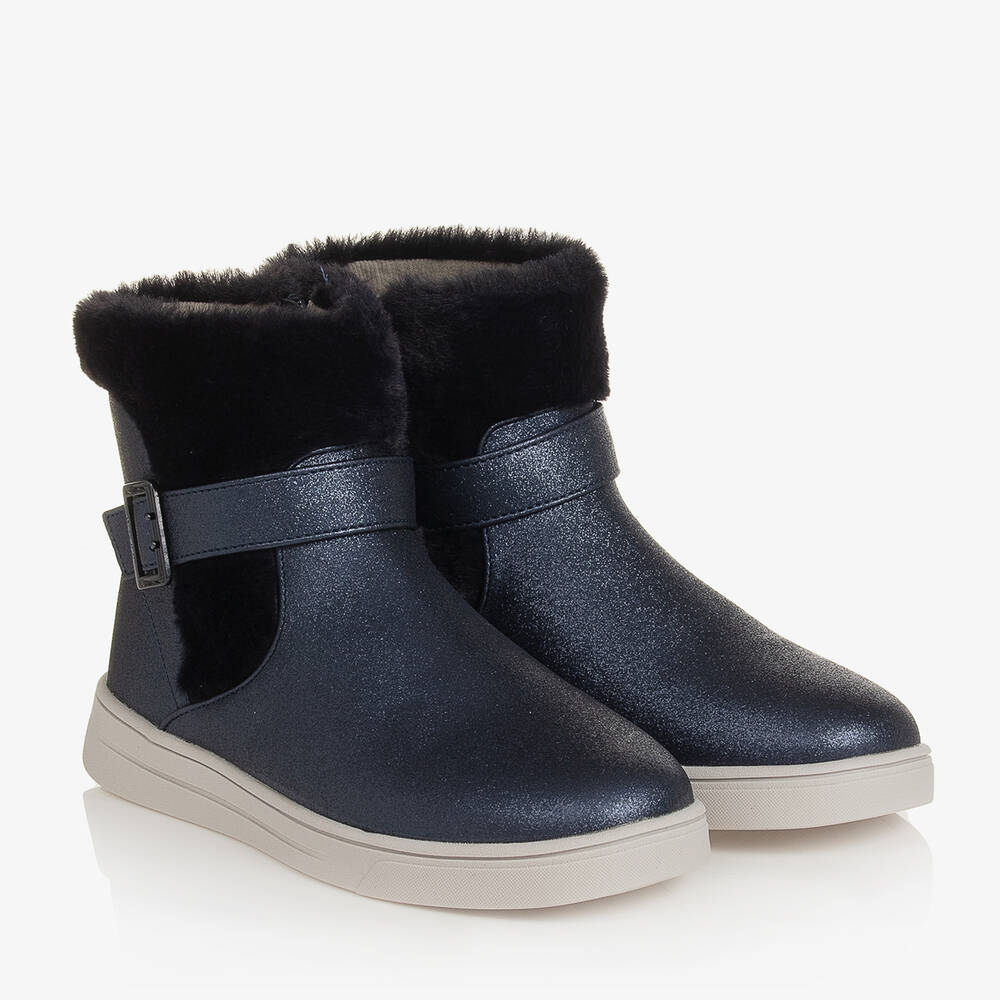 Gorgeous glittery blue, faux leather ankle boots for girls by Mayoral, lined in soft cotton needlecord. For a cosy feel, they are trimmed with super soft blue faux fur and have a decorative buckle strap across the ankle. Comfortable to wear, they have lightly padded insoles, non-slip rubber outer soles and fasten with a zip on the side, secured with a velcro tab. The lining is made with 65% recycled cotton.
