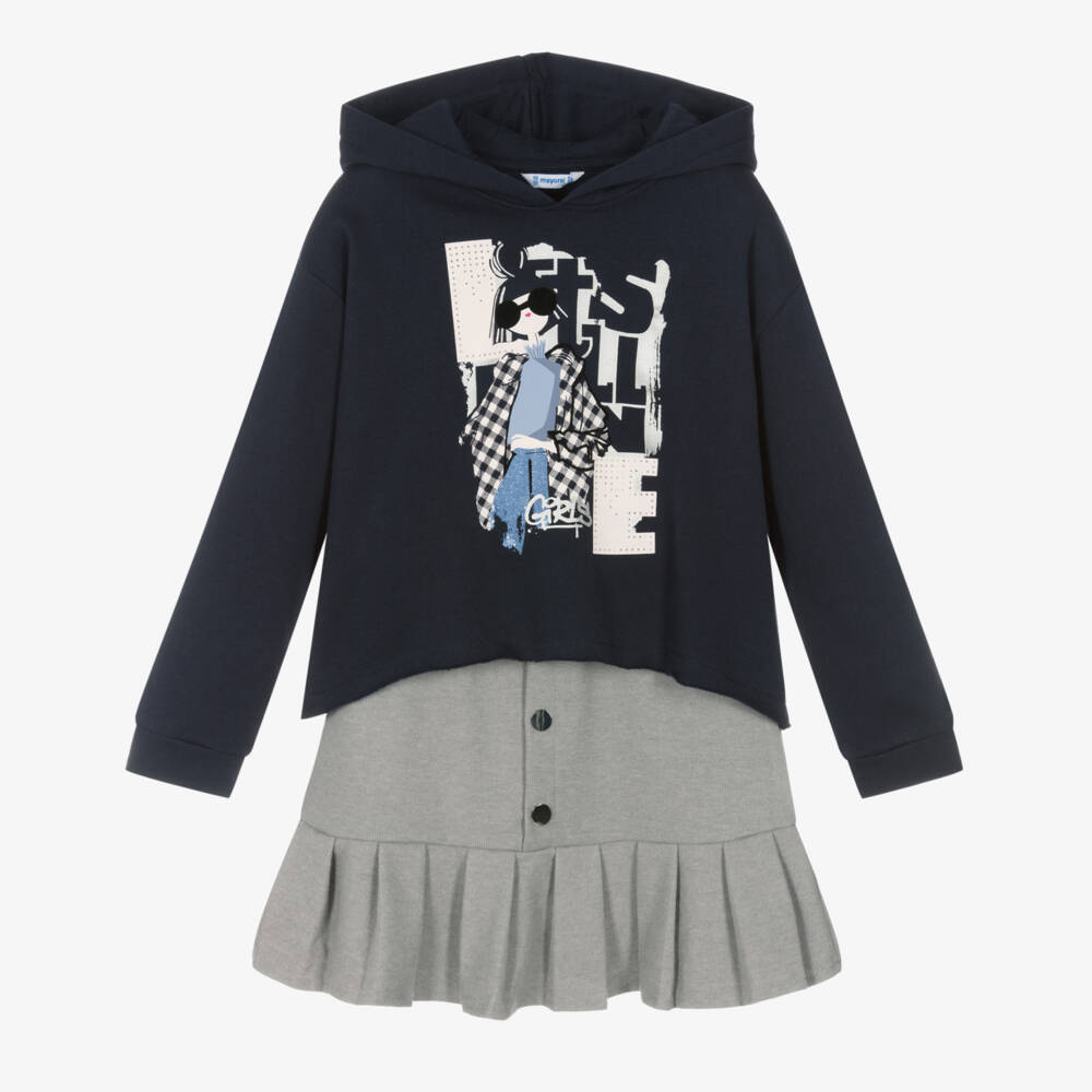 Cool style and comfort combine in this navy blue hoodie and grey skirt set for girls by Mayoral. The hooded top is made in a lightweight polycotton sweatshirt jersey, with a raw-edged hem that is raised at the front. It has a girl and slogan motif in ivory and silver, with sparkly diamantés. The grey jersey skirt has a fine striped weave, a soft brushed feel and a cute flippy hem. The waistband is elasticated and has decorative silver poppers on the front.
