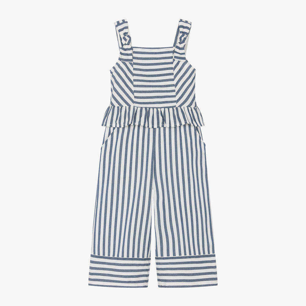Great for an effortless and stylish look, this navy blue and ivory striped viscose and cotton blend trouser set for girls is by Mayoral. Made from a soft and lightweight weave, the sleeveless panelled top has narrow straps with pretty bow decorations and a frilled hemline. Complete with an elegant square neckline, it has a shirred stretchy panel on the back for added comfort. The wide leg trousers have deep cuffs with horizontal stripes and an elasticated waist.