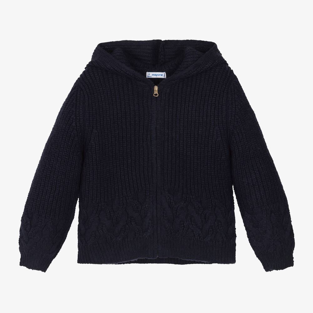 Navy blue zip-up hoodie for girls by Mayoral, made in a beautifully warm, chunky knit. Lovely for layering on cooler days, this cosy piece has cable knit detailing above the cuffs and hem, and stretchy ribbed trims for an extra snug feel. There is a shiny, gold-tone pull on the front zip fastening for a pretty finish. This item contains recycled fibres.