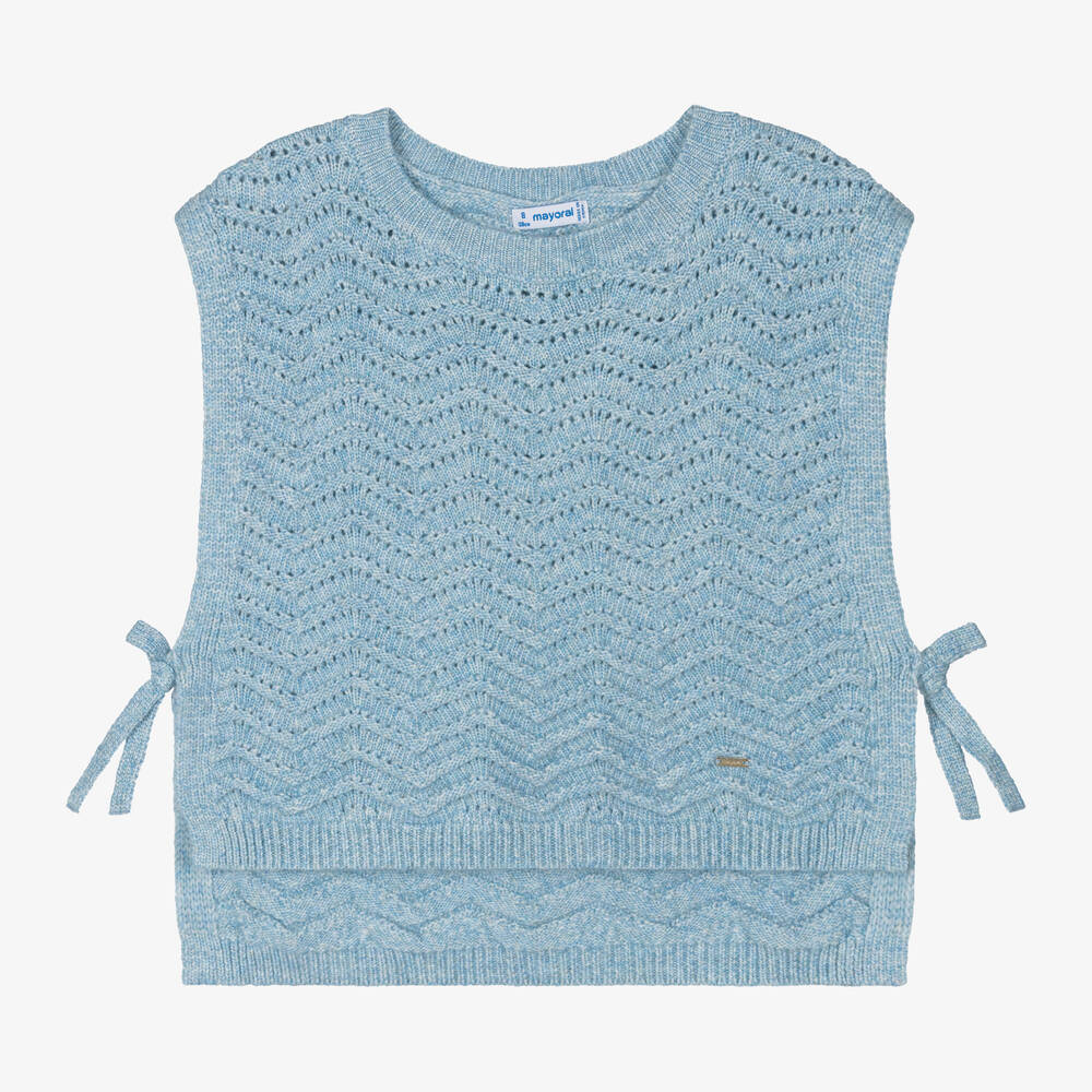 Lovely pale blue slipover for older girls by Mayoral, knitted in a soft viscose blend. It has a pretty chevron design and ribbed trims. The back is longer than the front and there are fixed bows on the sides. This stylish, sleeveless top has a small gold metal logo bar on the front. This item contains recycled fibres.