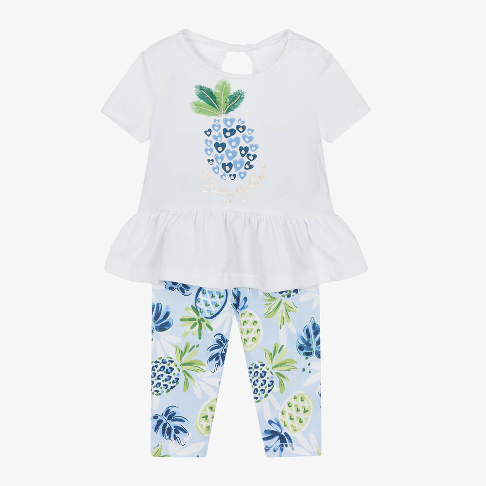 Sky blue and white leggings set for little girls by Mayoral, made in soft and stretchy cotton jersey for comfortable wear. The short-sleeved top has popper fastenings on one shoulder, with a ruffled hem and a twisted detail on the back of the neckline. The pineapple print on the front incorporates fabric feathers and a slogan that reads 'Stay Golden' in metallic gold font. In a lighter shade of pink, the full length leggings have a matching all over print and an elasticated waistband.