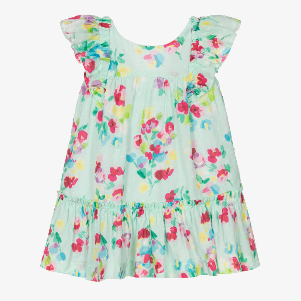 Pretty pale blue dress for little girls by Mayoral, woven in lightweight cotton with raised plumeti detailing. Lined in cotton for comfort, it has a gorgeous pink and blue floral print all-over and ruffle trims. The back of the dress has a gathered low V shape with a sweet popper bow appliqué. It fastens with a smooth concealed zip on the back for a seamless finish.