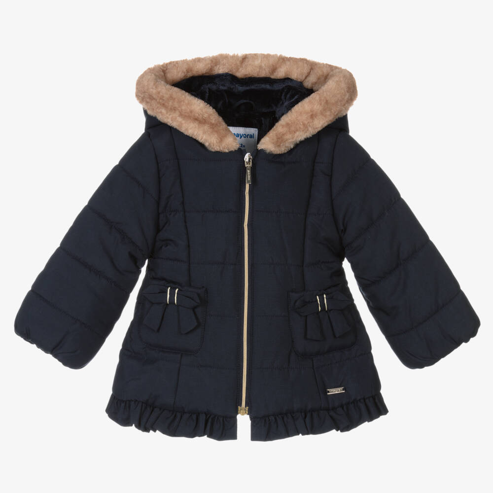 Cute navy blue puffer coat for little girls by Mayoral. Smooth and soft, with warm, recycled padding, this coat has a front zip fastening, gold-trimmed bow appliqués on the front pockets and a cosy hood. With stretchy elasticated cuffs to keep the warmth in, it has a snuggly plush lining for comfort. This item contains recycled fibres, reducing its environmental impact.