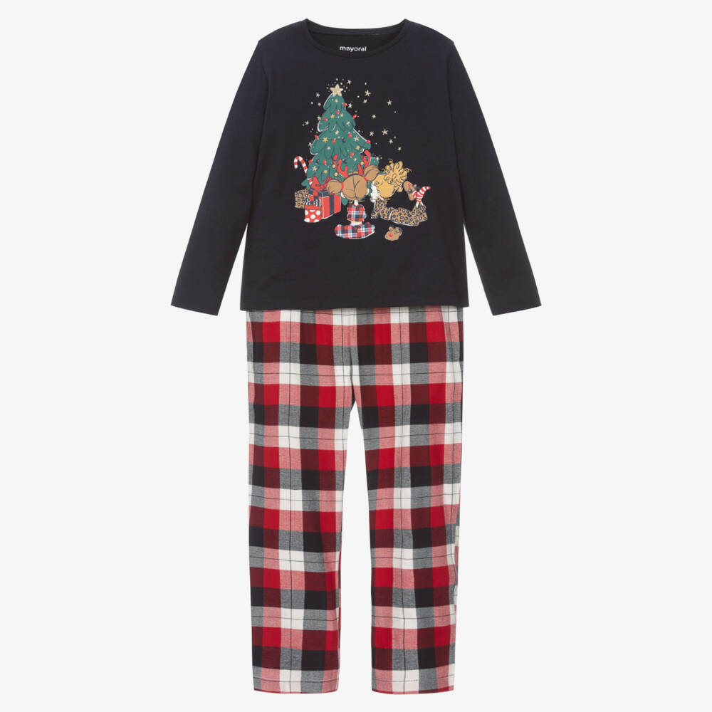 Cosy and comfortable for bedtime, these navy blue and red cotton pyjamas for girls are by Mayoral. The long-sleeved jersey T-shirt has a festive scene printed on the front, with glittery gold stars. The check patterned trousers are super soft with an elasticated waistband. These pyjamas come with a matching drawstring pouch for neat storage.