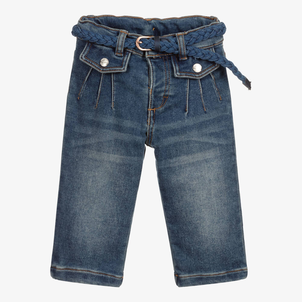Blue jeans for little girls by Mayoral, made in soft stretch denim, with faded patches. There are faux front pockets, back pockets and a popper fastening. They have a removable plaited denim belt and a useful adjustable waist.