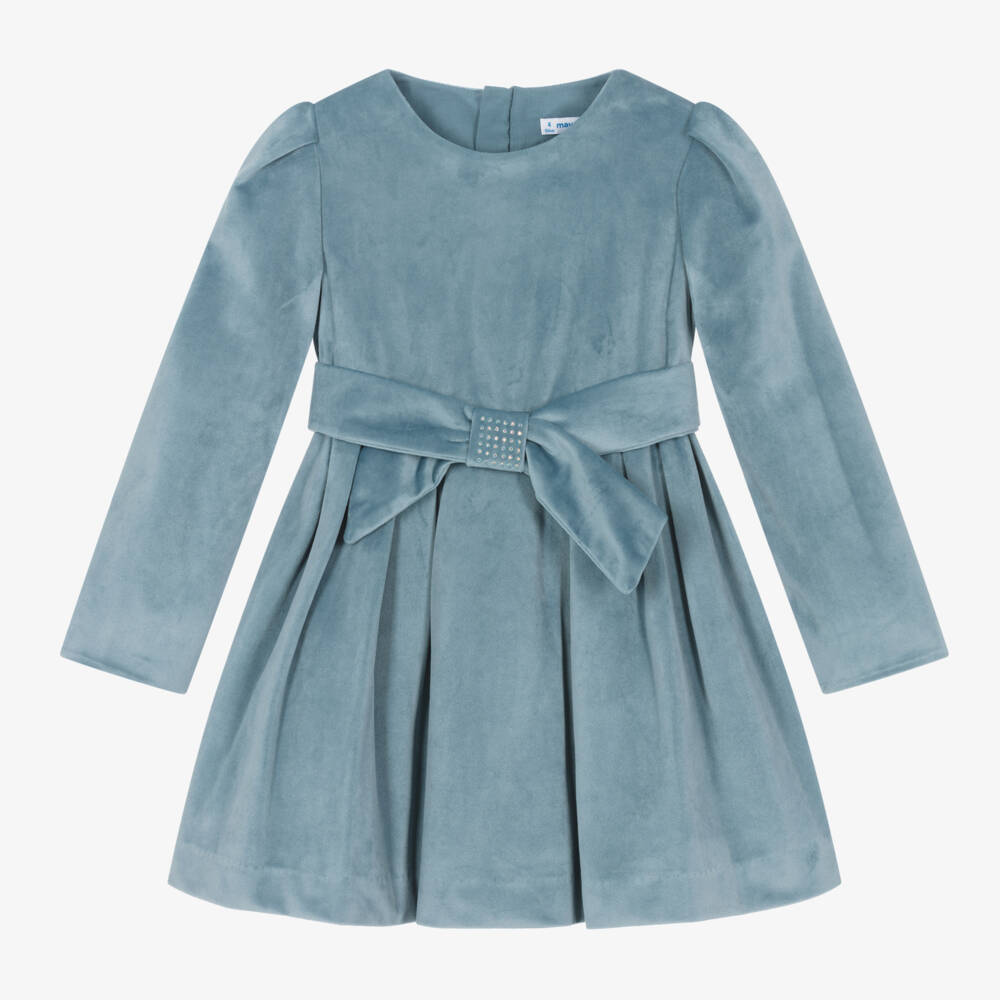Lovely for a smart occasion, this blue velvet dress for girls is by Mayoral. There are elegant puffed sleeves and the removable bow belt is trimmed with sparkling diamantés. The dress is lined in lightweight cotton voile for comfort, with a concealed zip fastening on the back for a neat finish.