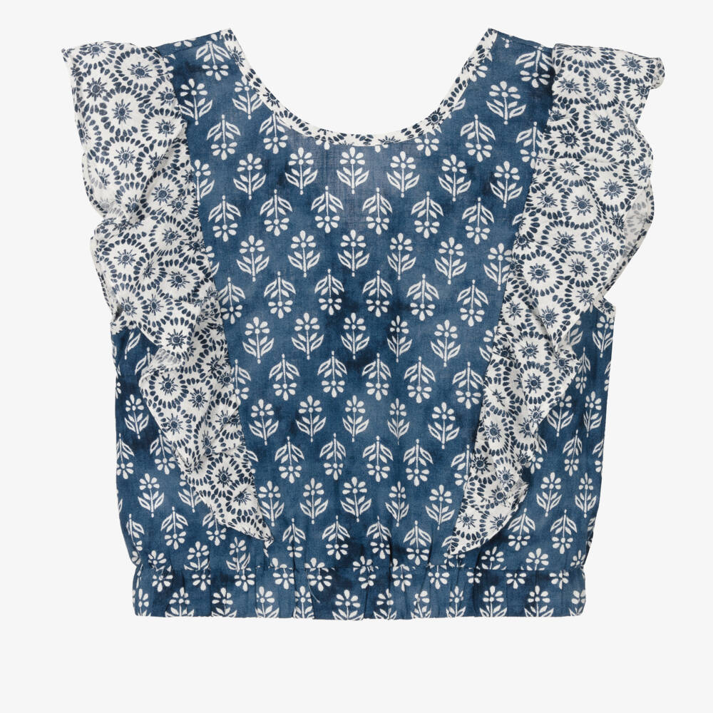 Navy blue blouse for girls by Mayoral, made in soft lightweight cotton with a pretty white floral pattern. It has white ruffle trims over the shoulders with a contrasting blue circular print and there is a stylish crossover effect back. The hem is elasticated, with a sash tie at the back.