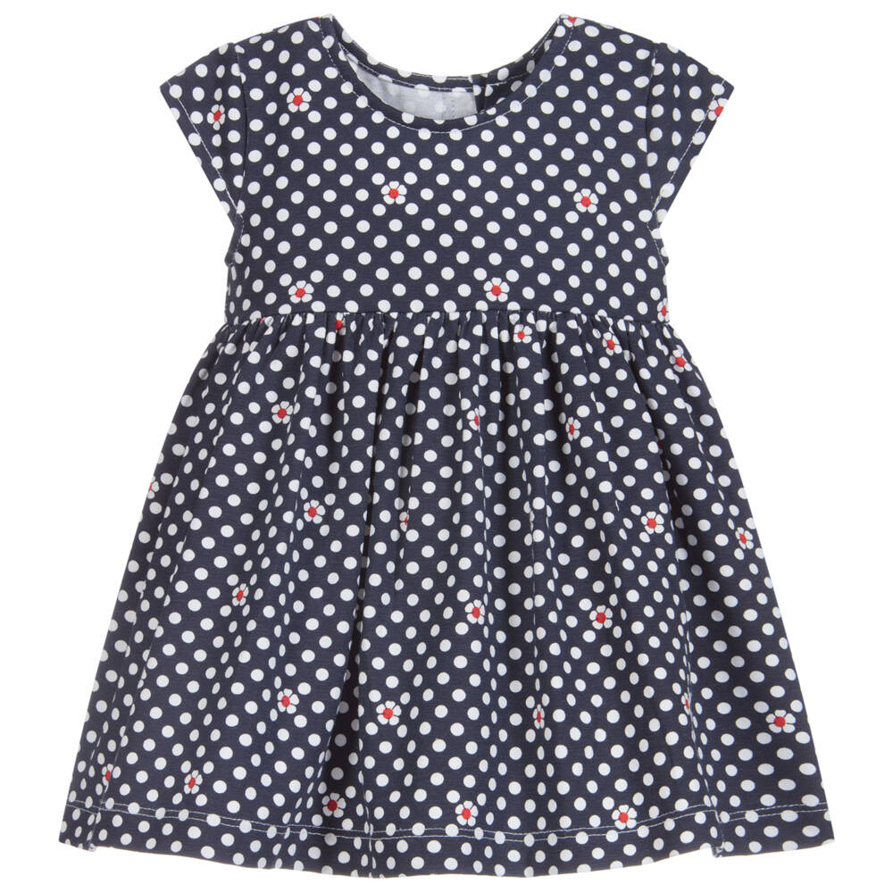 Navy blue jersey dress for little girls by Mayoral, with a white dot and red flower pattern. Soft and stretchy, it is made in sustainable cotton.