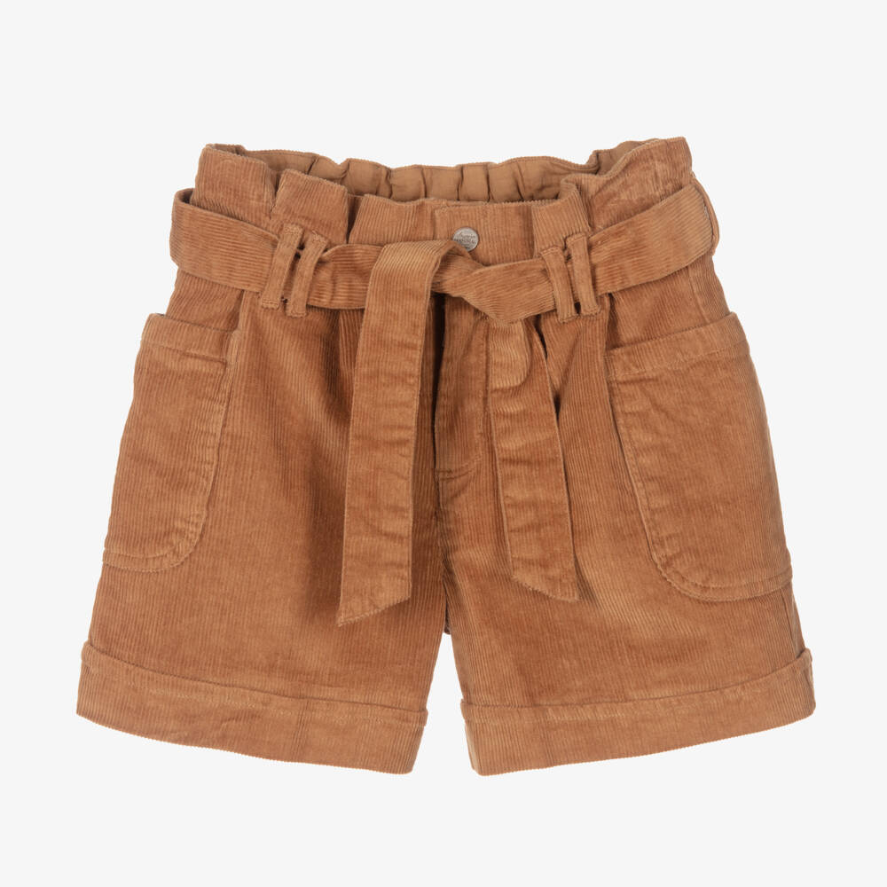 Stylish tan brown shorts for girls, by Mayoral. Made in soft cotton corduroy, they have a lovely tie-up belt, and an adjustable paper bag style waist that can be altered as your child grows.