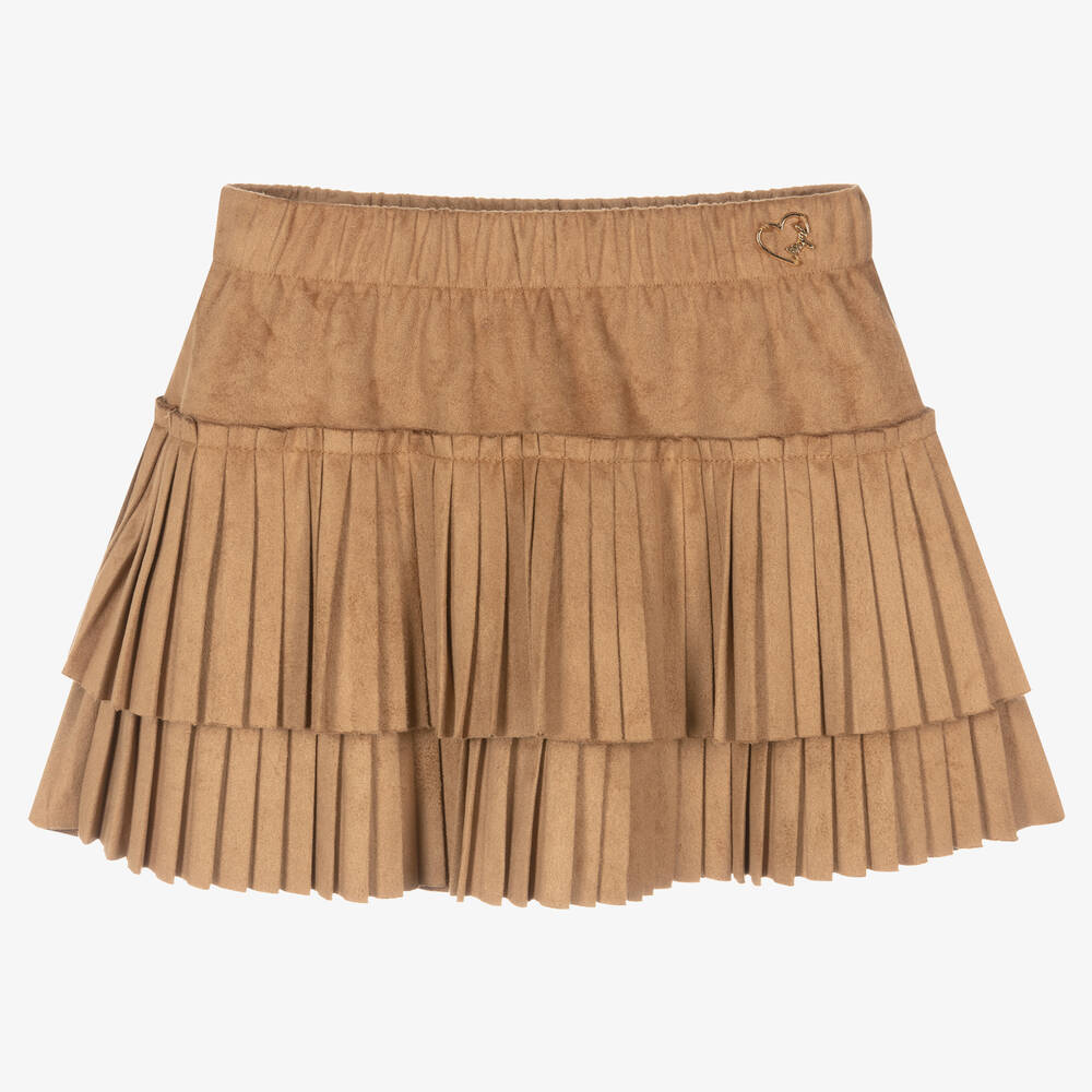A lovely camel brown skirt for girls by Spanish brand, mayoral, made in stretchy jersey with a super soft faux suede look. It is designed in a tiered look with pleats and a gold metal heart logo charm on one side. The waistband is elasticated for easy pull-on.