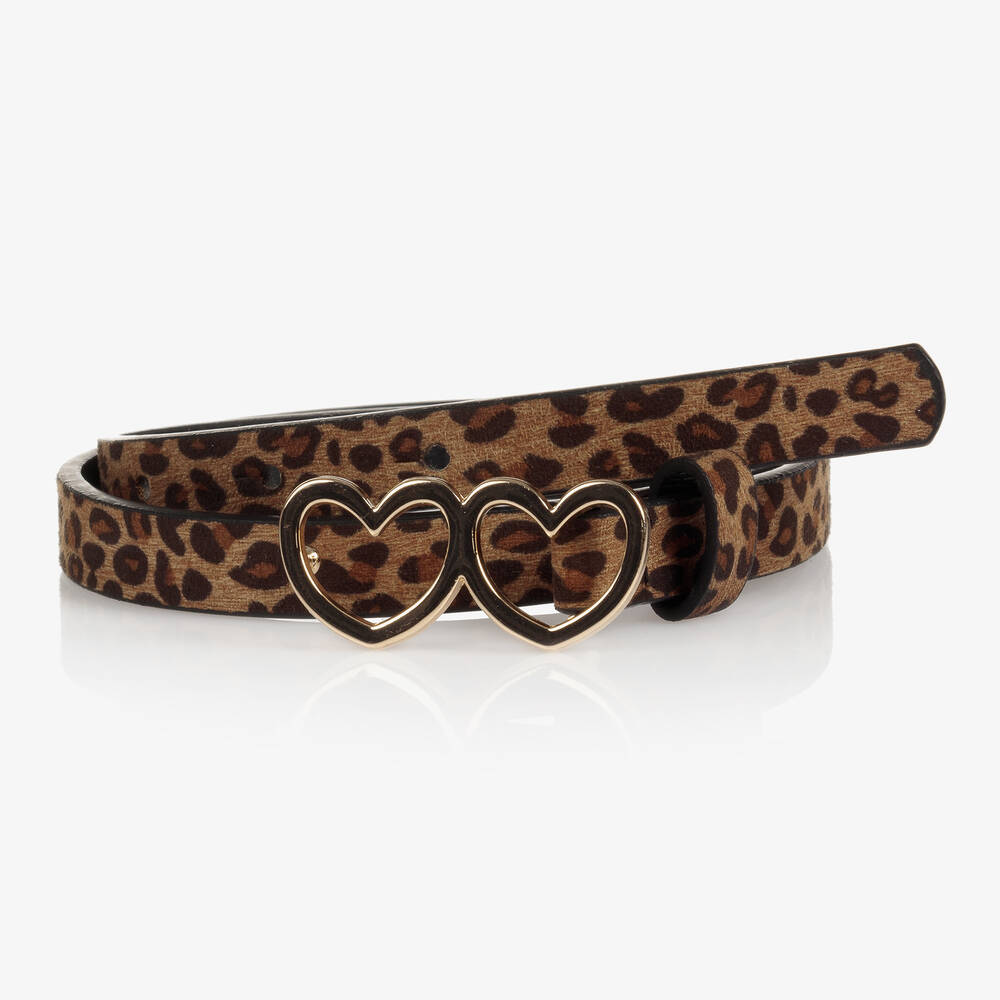 Brown leopard print belt by Mayoral, made in soft faux suede and leather. This stylish belt fastens with a gold heart-shaped pin buckle.