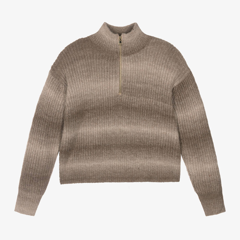 Brown sweater for older girls by Mayoral, made in a soft knit, with a subtle tonal gradient effect. This casual top has ribbed trims and a gold half-zip fastening on the front.