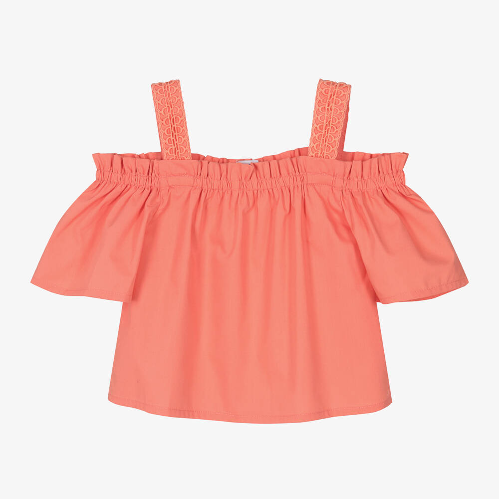 Coral pink, short-sleeved blouse for older girls by Mayoral, made in a soft and lightweight cotton blend. Lovely for sunny days, it has an elasticated neckline and open shoulders. The straps are detailed with decorative lace trims for a pretty finish.