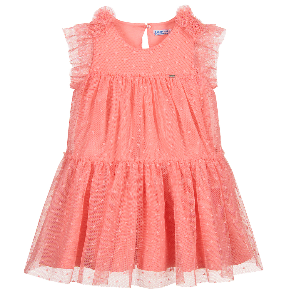 In a lovely shade of coral pink, a spotted tulle dress for girls by Mayoral, with a lightweight cotton jersey lining. Ideal for a special occasion, it has sheer short tulle sleeves, with pretty rosettes on each shoulder.