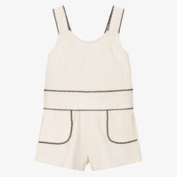 In a neutral ivory shade, this cotton shorts set for girls is by Mayoral. Ideal for warm days, it is made in textured jersey with black blanket stitch detailing. The sleeveless top has a square neckline and a gathered back for a good fit, whilst the matching shorts are styled with patch pockets and a comfortable elasticated waistband. The set is easy to wear, simply pulling on.