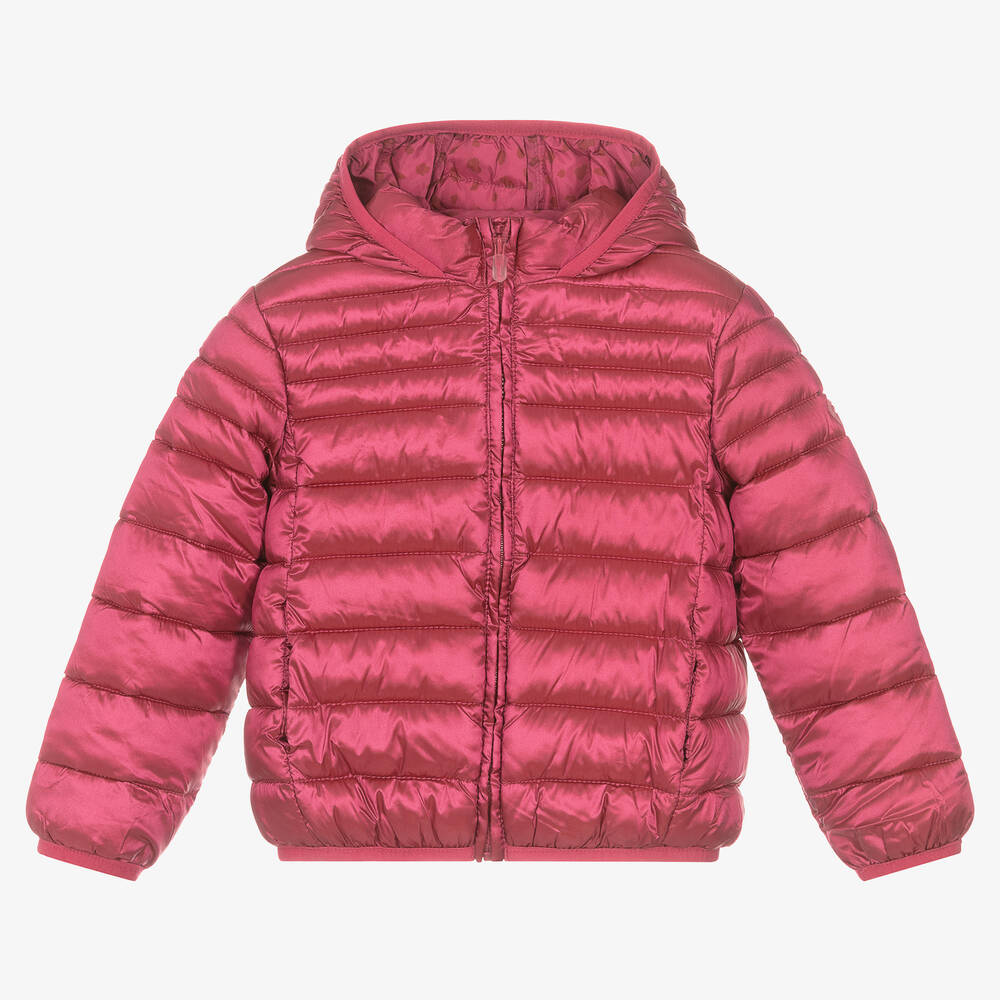 Dark pink hooded puffer jacket for girls by Mayoral. Made with recycled fibres, this silky smooth jacket has a pretty pearlescent sheen and a beige leopard print lining. Lightly padded, there are front pockets and a concealed zip fastening on the front.