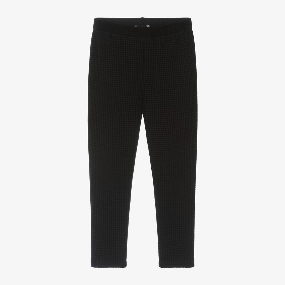 Stylish black leggings for girls by Mayoral, with a textured, flocked, dogstooth pattern. This full-length style is made in soft, stretchy jersey with a comfortable, elasticated velour waistband to complete the look.