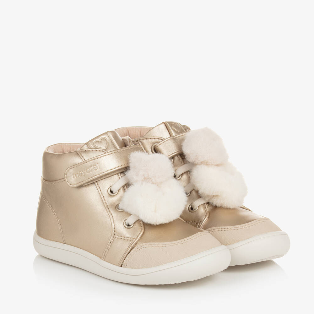 Cool, lustrous gold high-top trainers for little girls by Spanish brand Mayoral, with cute, ivory faux fur pom-poms on the elasticated laces. They are embossed with a logo and heart on the tongue, and fasten with a velcro strap across the foot and a side zip. There is a beige corduroy lining and a comfortable, cushioned leather insole, with a non-slip, rubber sole.