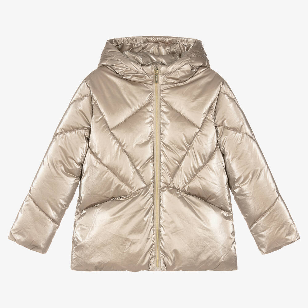 Pretty metallic gold hooded puffer jacket for girls by Mayoral. Silky smooth, it is lined with soft fleece for comfort and has mid-weight padding for added warmth. This cosy coat has concealed pockets on the front and fastens easily with a branded gold zip.