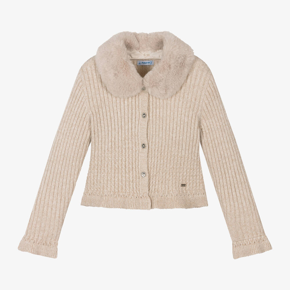 Champagne gold ribbed cardigan for girls by Mayoral, with cable-knit details. Made in a soft blend with viscose, this glittering cardigan has a removable, button-on collar in faux fur. It has silver-hued buttons to fasten on the front. This item contains recycled fibres.