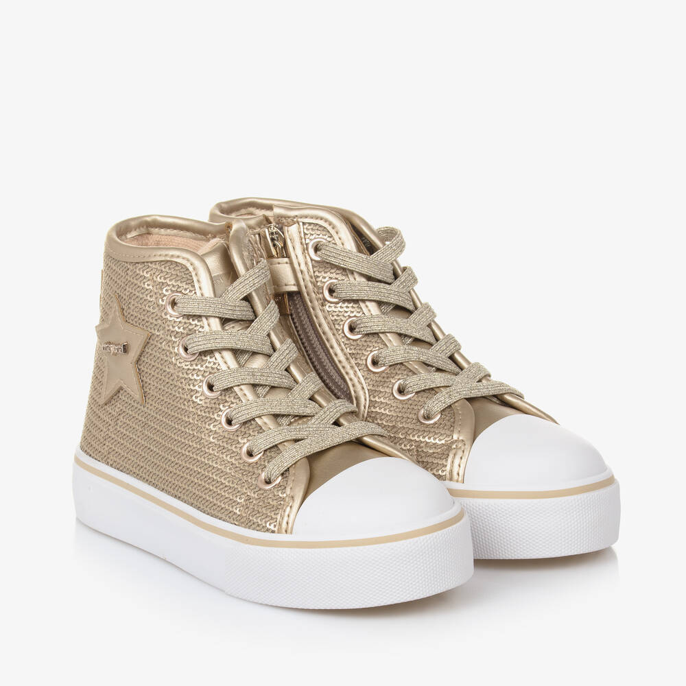Gorgeous gold high-top trainers for girls by Mayoral, covered in matte sequins and trimmed with faux leather. They have branded star details on the side and tongue, with glittery, elasticated laces for a touch of sparkle. A practical side zip allows for speedy changes and they have a soft textile lining and a cushioned insole for comfort. Chunky yet flexible, the white and beige rubber sole is textured for good grip.