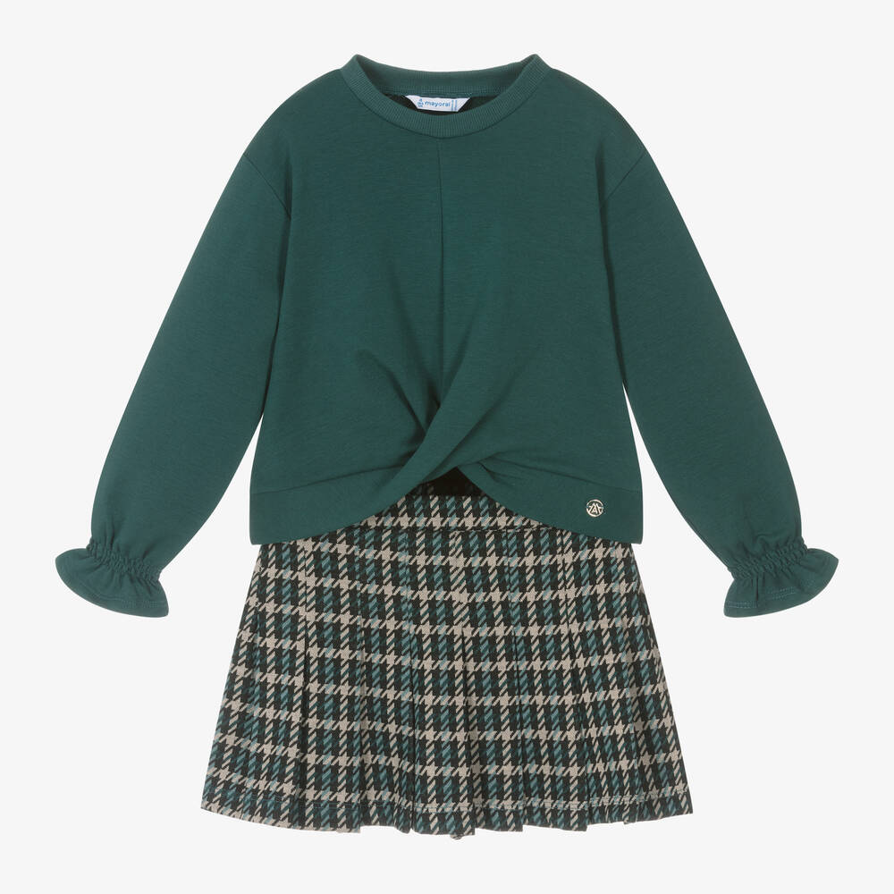 This lovely green skort set for girls by Spanish brand Mayoral, combines modern and traditional design. Fleecy on the inside, the long-sleeved jersey top has a ribbed neckline and elasticated, shirred cuffs. It has a lovely crossover design on the front and a branded charm on the hem. The pleated skort, patterned in a green and light beige houndstooth check, has a fully adjustable waistband for comfort.