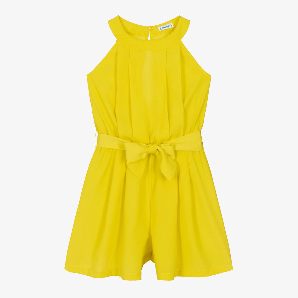 In a vibrant shade of lime green, this playsuit for older girls by Mayoral is made from smooth and lightweight crêpe. Great for a stand-out look, this lovely sleeveless style has subtle pleated details on the bodice, a pretty curved neckline, and attached ties that cinch in the elasticated waist. It fastens with a keyhole button on the back for a neat finish.