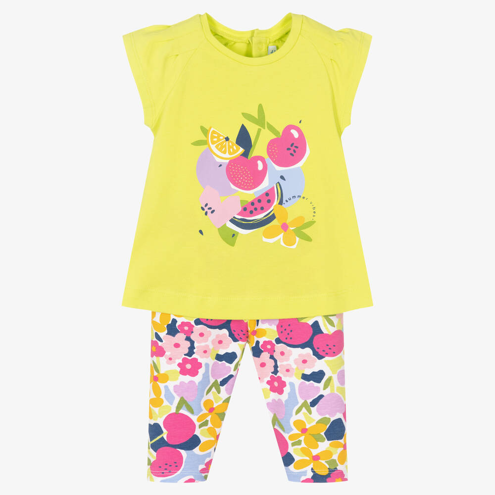Lime green and pink leggings set for little girls, by Spanish brand Mayoral. Lovely for bright summer days, this colourful set is made from soft and stretchy cotton jersey. The lime green T-shirt has a colourful fruits print on the front with sparkly decorations. It fastens with useful poppers on the back and has casual capped sleeves. It pairs with matching patterned leggings for a cute, coordinated look.