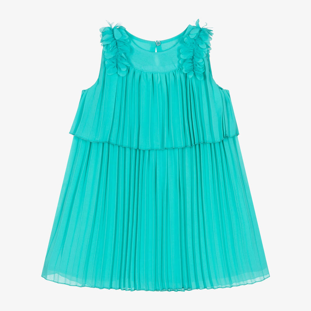 A pretty aqua green dress for girls by Mayoral, made from delicately pleated chiffon. Lightweight and flowy, this sleeveless dress has ruffled tulle trims on the shoulders and a tiered bodice. It is lined in soft voile for comfort and has a neat keyhole button fastening on the back.