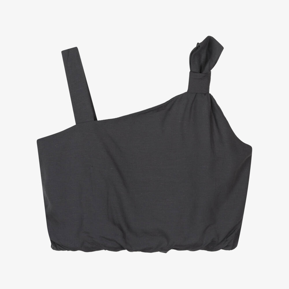 Simply stylish, a dark grey cropped top for older girls by Mayoral, made in a cool blend of viscose and linen. This asymmetric design has a lovely bow detail on one strap, a shirred panel on the back and an elasticated hem for a gently puffed look. Soft and lightweight for warmer days, it is cotton-lined for extra comfort.