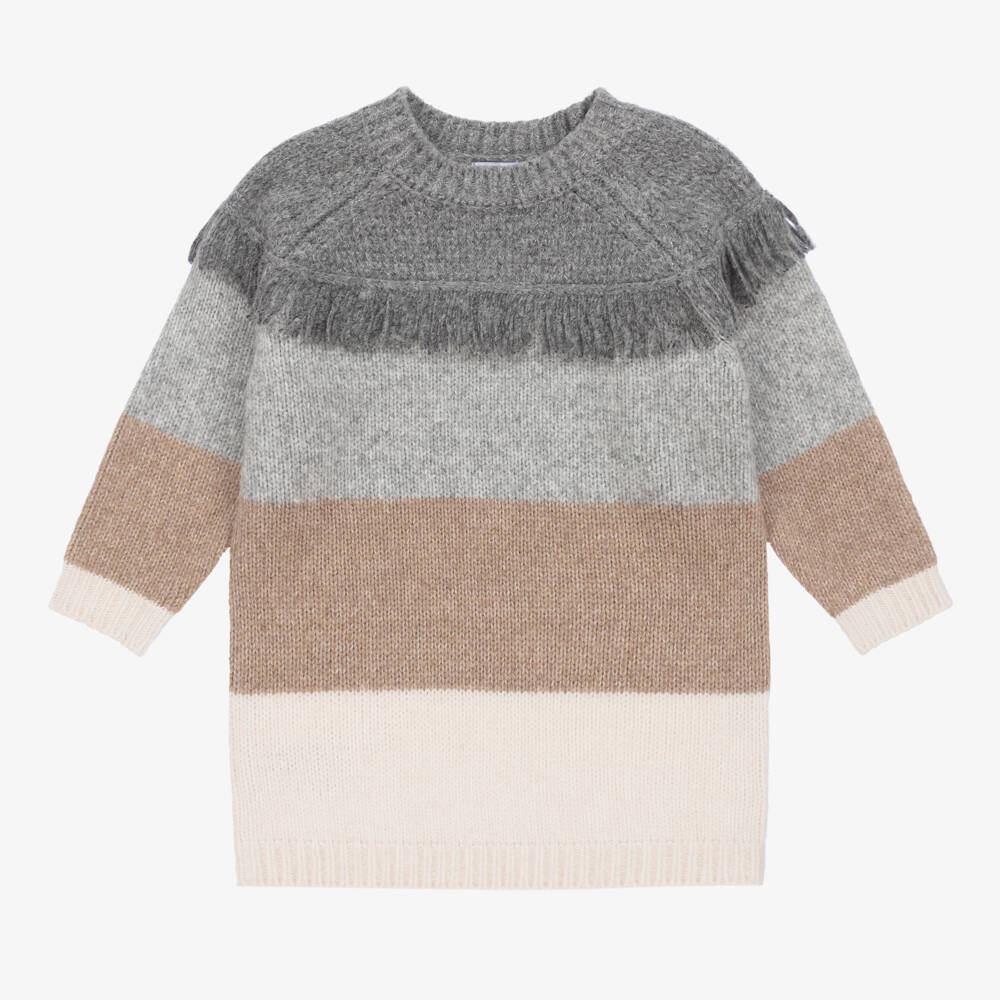 Lovely sweater for girls from Mayoral, in chunky grey, beige and ivory colour block stripes. Super soft and cosy, it is knitted from recycled yarn with a touch of wool for added warmth. There are shimmery silver threads around the yoke for a touch of sparkle and pretty fringing detailing around.