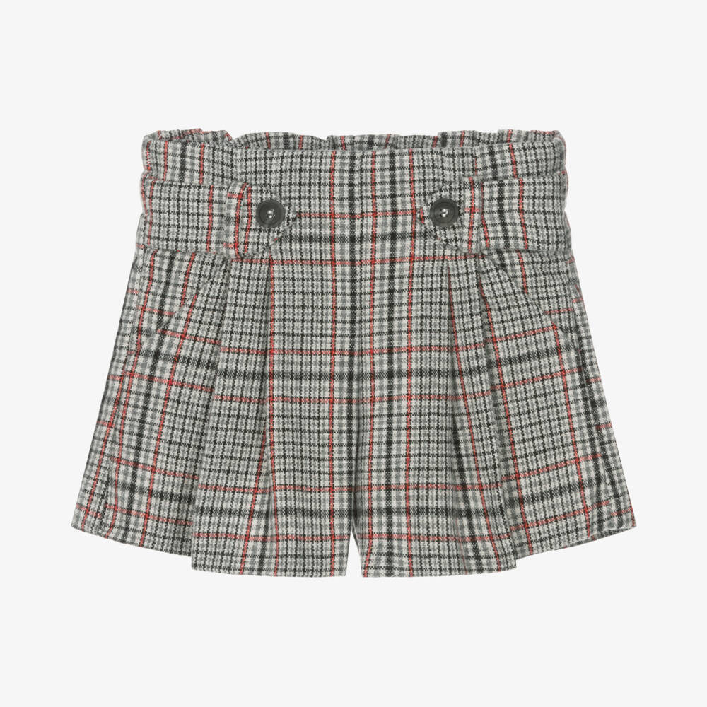 Stylish shorts for girls by Mayoral, in a grey, black and red check pattern. Softly woven with a touch of wool for warmth, they are pleated at the front and gathered at the back for a full shape. An easy-to-wear, slip-on style, they have smart button tab detail on the waist and useful front pockets. The waistband is adjustable and they have a comfortable lightweight cotton-blend lining.