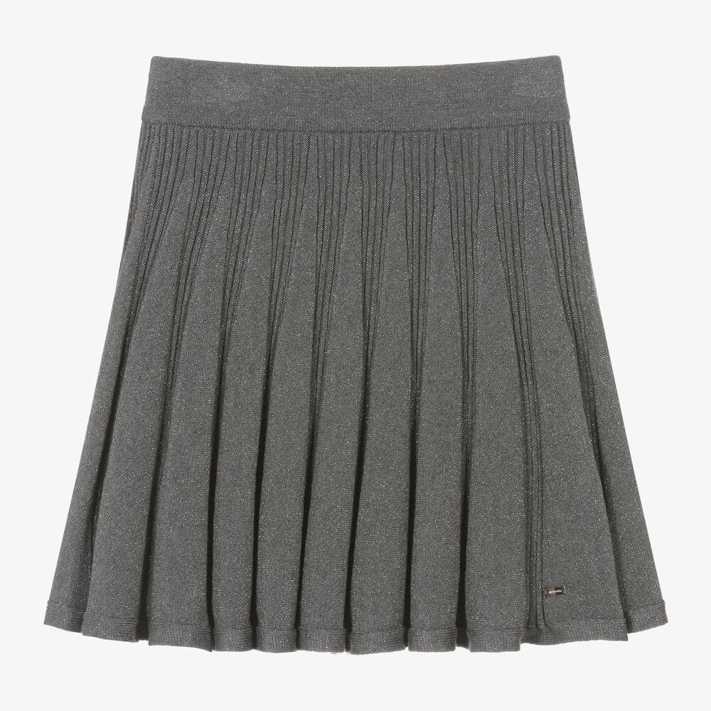 A stylish grey skirt for older girls by Mayoral, beautifully knitted with pleats. Soft and stretchy, it is made with silver yarn for a subtle glitter sparkle. The waistband is stretchy for comfort and a silver logo plate above the hem completes the look.