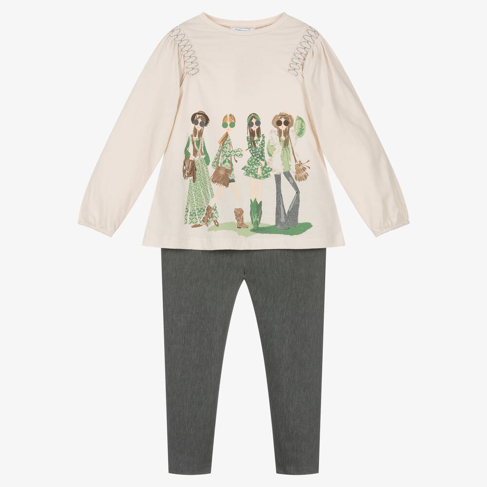 Pretty pale beige top and grey ankle-length leggings set for girls by Mayoral, both made in soft and stretchy cotton jersey. The tunic length top is detailed with lovely smocking details on the top of the puffed sleeves and a Bohemian-style girls print on the front. The set is made in sustainable cotton.