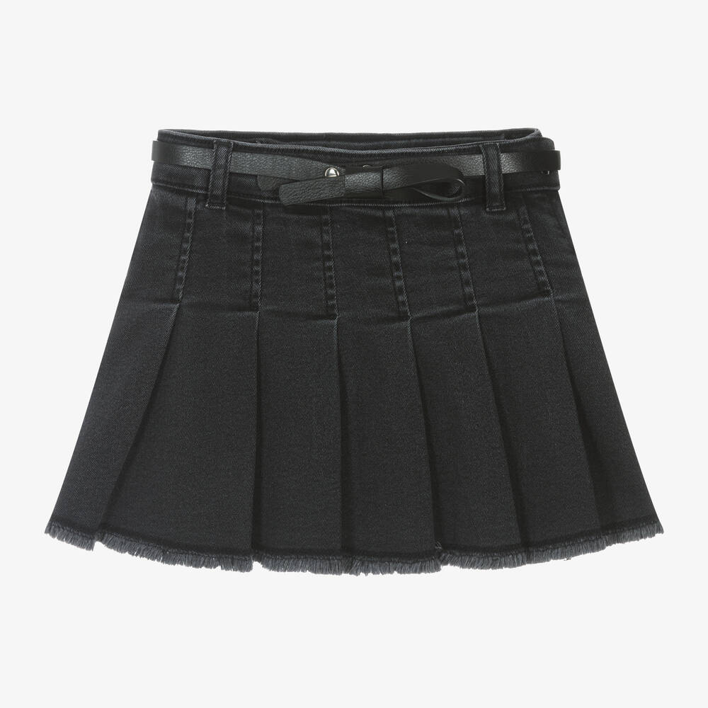 In a cool dark grey wash, this mini denim skirt for girls is from Spanish brand Mayoral. Made in a soft cotton blend with a comfortable stretch, it is stylishly pleated for a preppy look and has a frayed hem. It fastens with a side zip and branded popper on the side and has an adjustable waistband with a silver faux leather logo patch on the back. A detachable black faux leather belt with bow detailing and adjustable poppers, gives it a lovely finishing touch.
