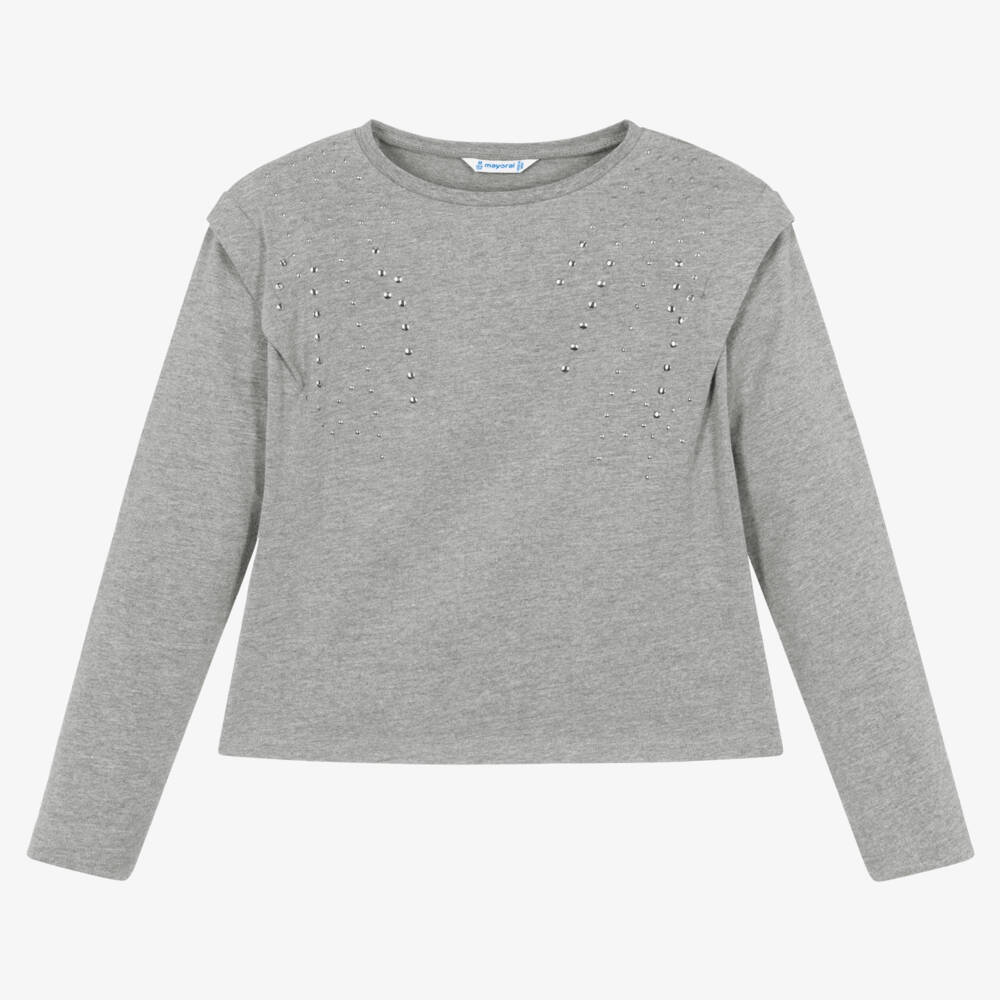A grey T-shirt for girls by Mayoral, made from soft and stretchy cotton jersey. This casual long-sleeved tee has silver studded detailing on the front, with a folded pleat on the shoulders for added shape.