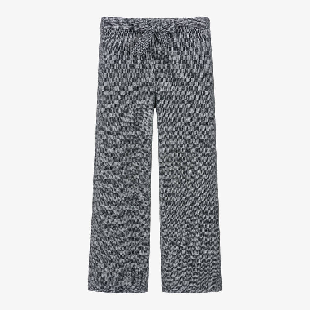 Grey viscose-blend trousers for girls by Spanish brand Mayoral, with a subtle black chevron design. Beautifully soft, they are styled with a modern wide-leg silhouette. The waistband is partially elasticated for comfort, with a fixed sash that ties neatly on the front to complete the look.