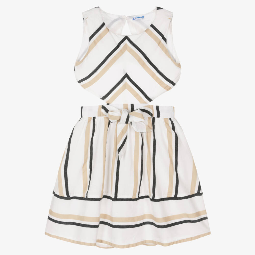 Ivory, beige and black striped dress for girls by Mayoral, made in a super soft cotton blend. With chevron stripes on the bodice, this sleeveless dress has a rounded neckline and a fully lined skirt for added comfort. The cut out detailing on the side of the body and back is framed by a fixed belt on the waist that ties at the front. There are two button fastenings and a concealed zip fastening on the back for a secure fit.