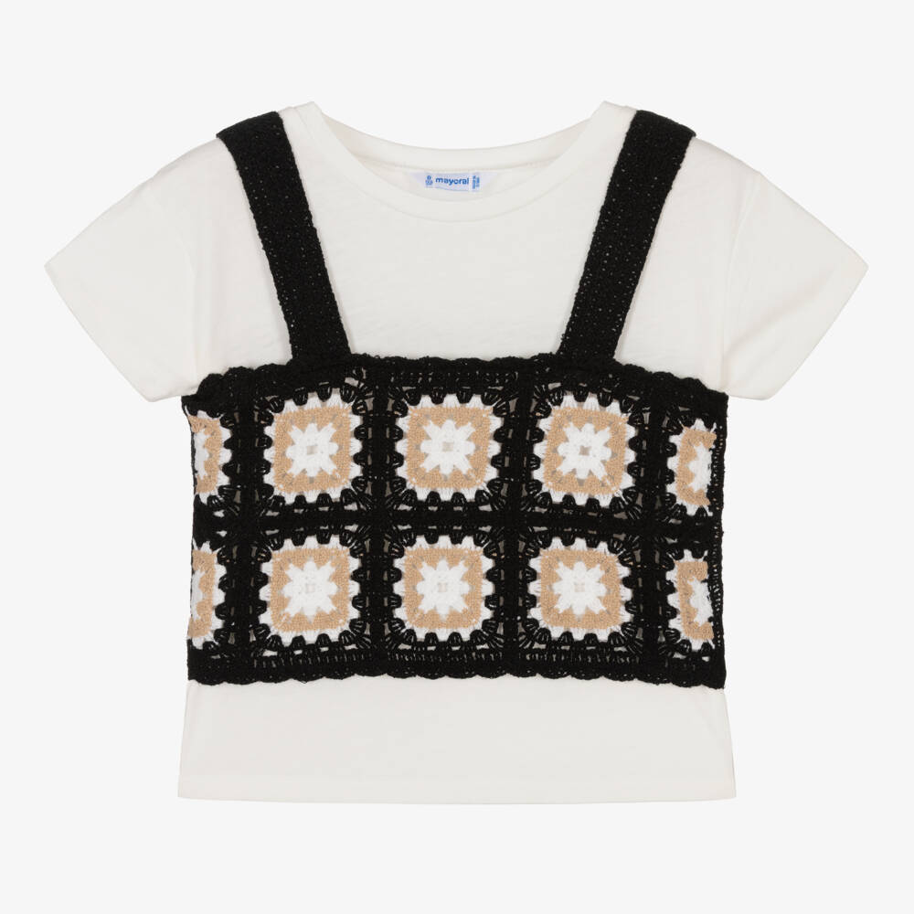 An ivory cotton T-shirt by Mayoral, with a black crochet top overlay. Ever versatile, the boxy crew neck T-shirt comes with a cute crochet vest top in a black, beige and ivory patchwork pattern. It has wide shoulder straps and a cropped scalloped hem, creating a cute, layered look.