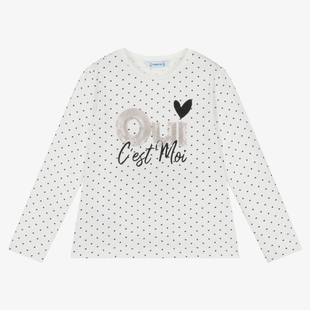 Patterned with black hearts, this ivory long-sleeved top for girls is from Spanish brand, Mayoral. On the front, it has the words, 'Oui, C'est Moi' in silver sequins and black embroidery, with a sweet black heart detail. Ideal for layering and transitional wear, it is made in comfortable cotton jersey.