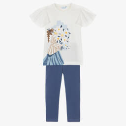 Charming ivory and navy blue leggings set for girls by Mayoral, ideal for comfortable casual wear. Made from soft cotton jersey, the ruffle-sleeved top features a delightful print of a girl holding a large floral bouquet with delicate appliqué detailing. The navy blue leggings are full length and have a comfortable elasticated waist.